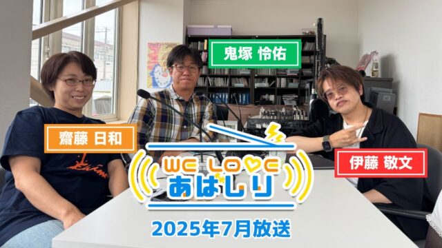 今月はゲストなしで、パーソナリティー3人の緩いトークをお届けします!3人の2025年上半期ベスト〇〇を発表!そして、番組の最後に新しい発表も……!?「WE LOVE あばしり」は毎月第三木曜日15時から、再放送は第四木曜日11時からFMあば...