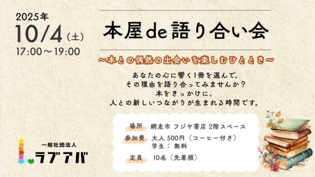 語り合い会 本屋 de 語り合い会【2025.10.4開催】 イベント開催のお知らせ10月4日(土)午後5時から網走市 apt.4網走中央商店街の本屋フジヤ書店で【本屋de語り合い会】を開催します。素敵な1冊との出会いや読んだ感想や作家についてのお話などを美味しいコーヒーと共に語り合ってみませんか?新... 2025.09.26 イベント語り合い会